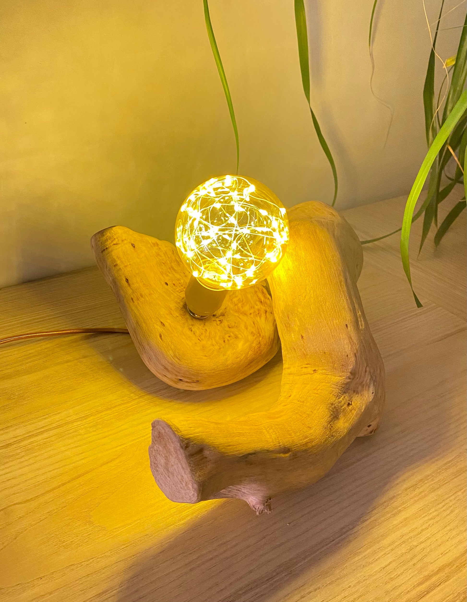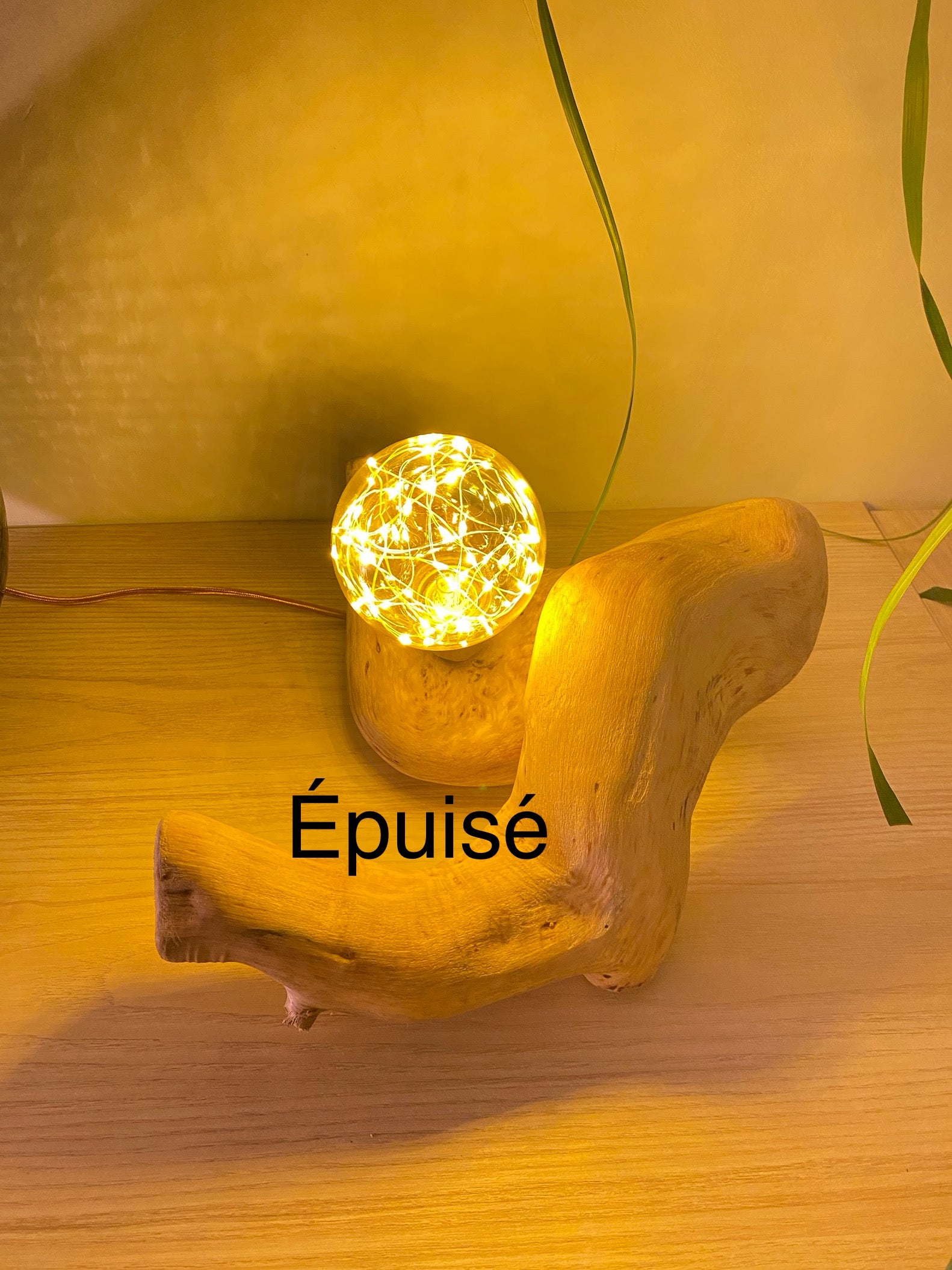 Lampe en bois flotté blanchie naturellement par le soleil sur les plages de Hyères.
