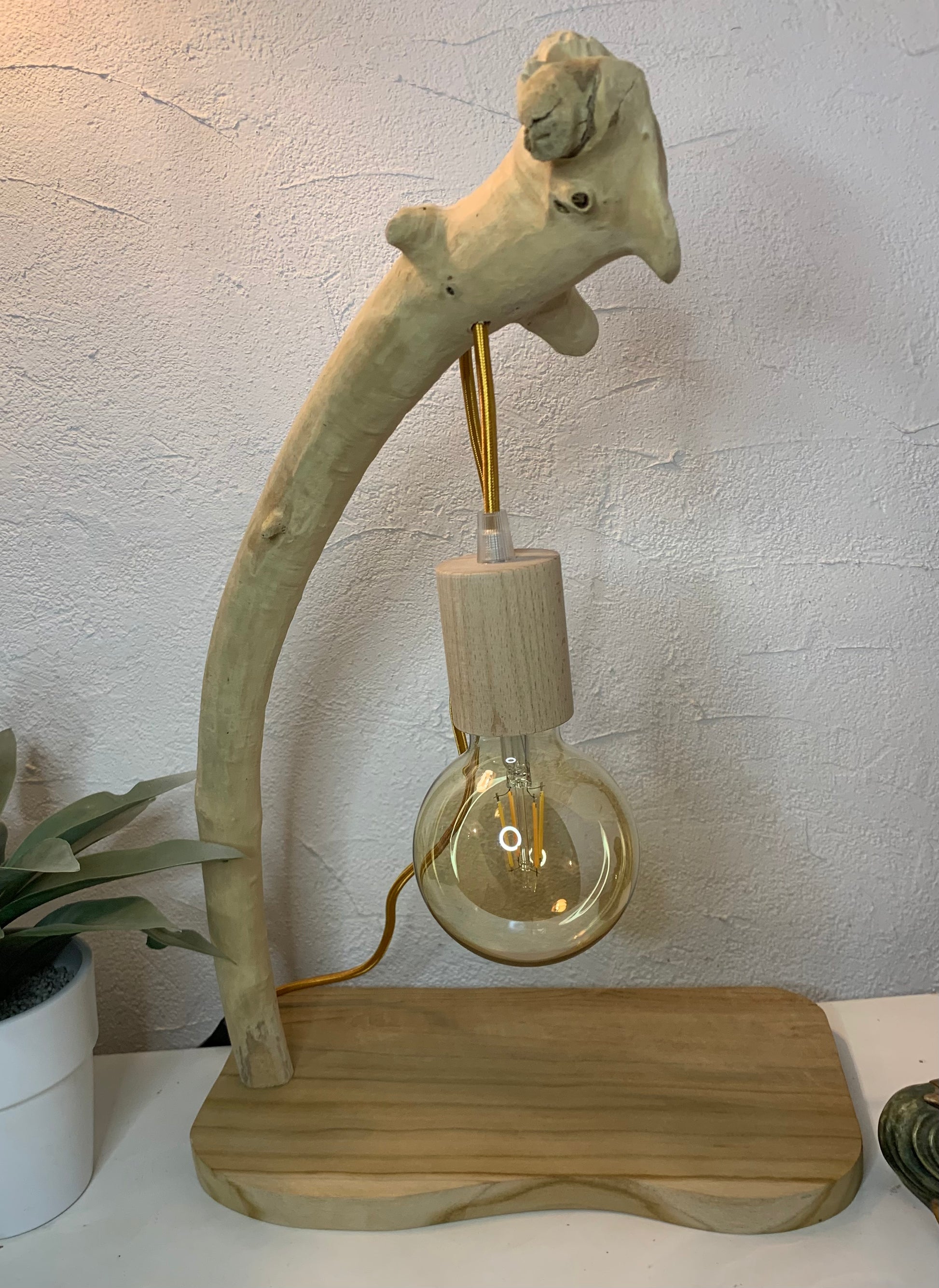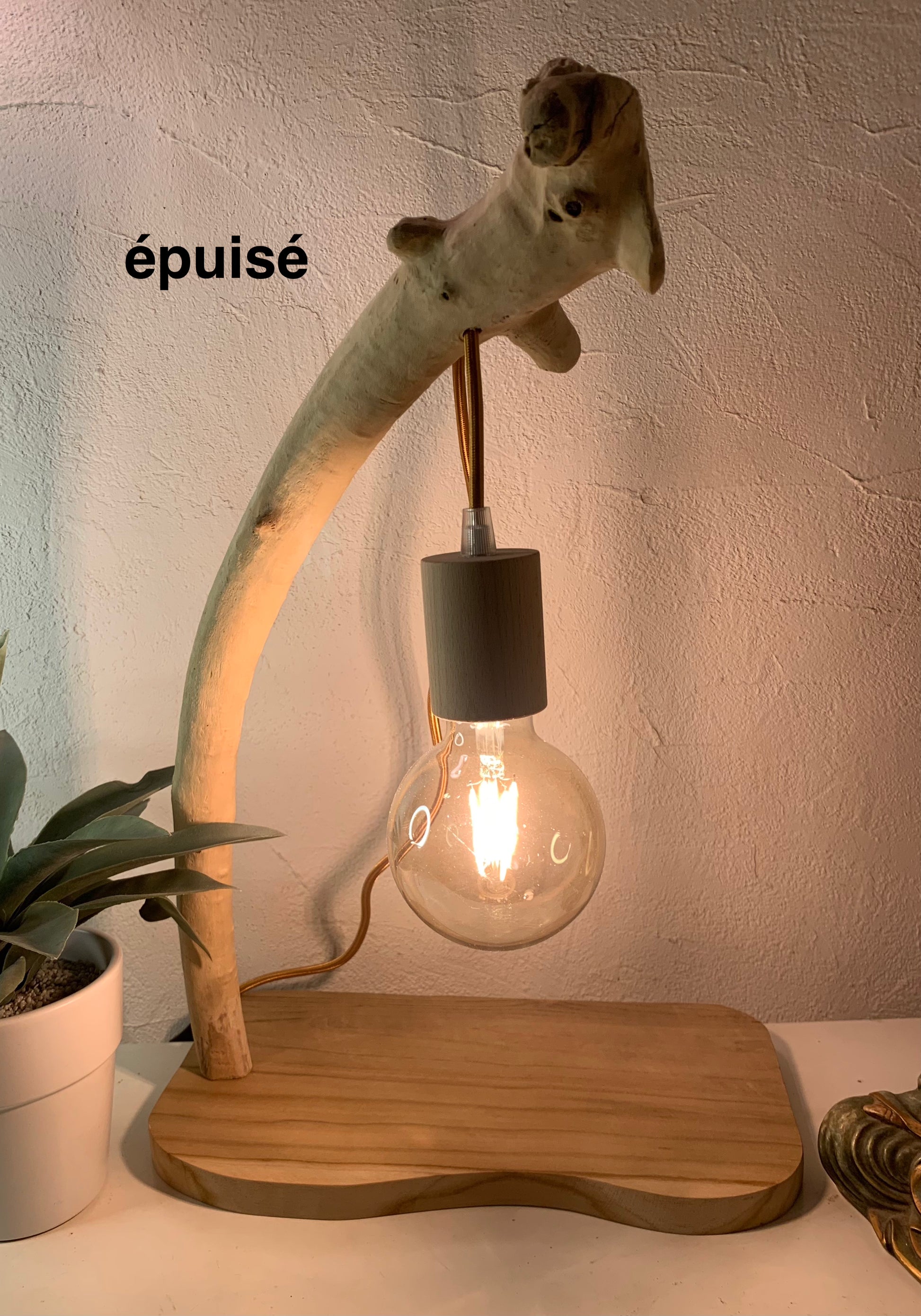 Lampe en bois flotté blanchie naturellement par le soleil sur les plages de Hyères.