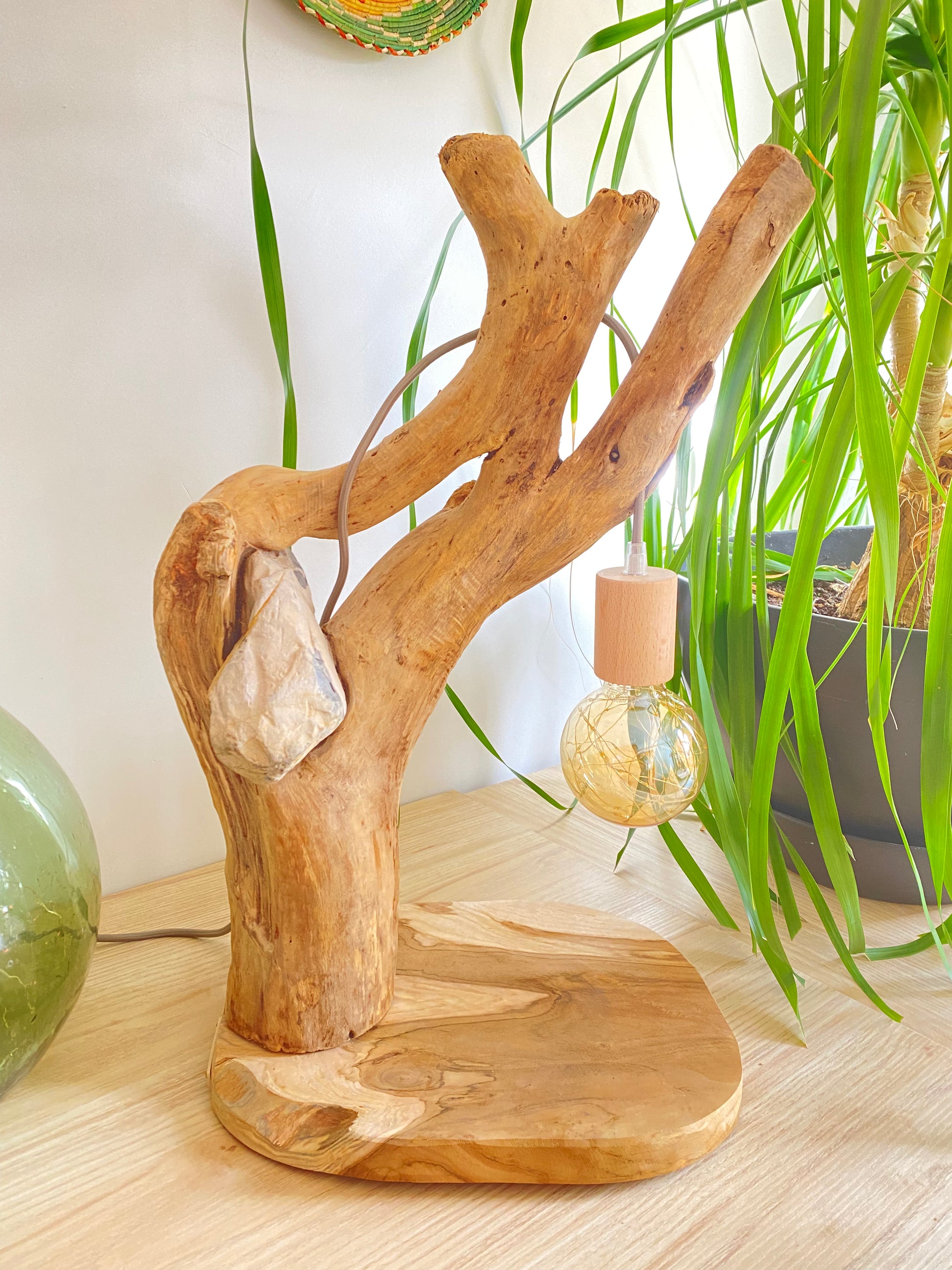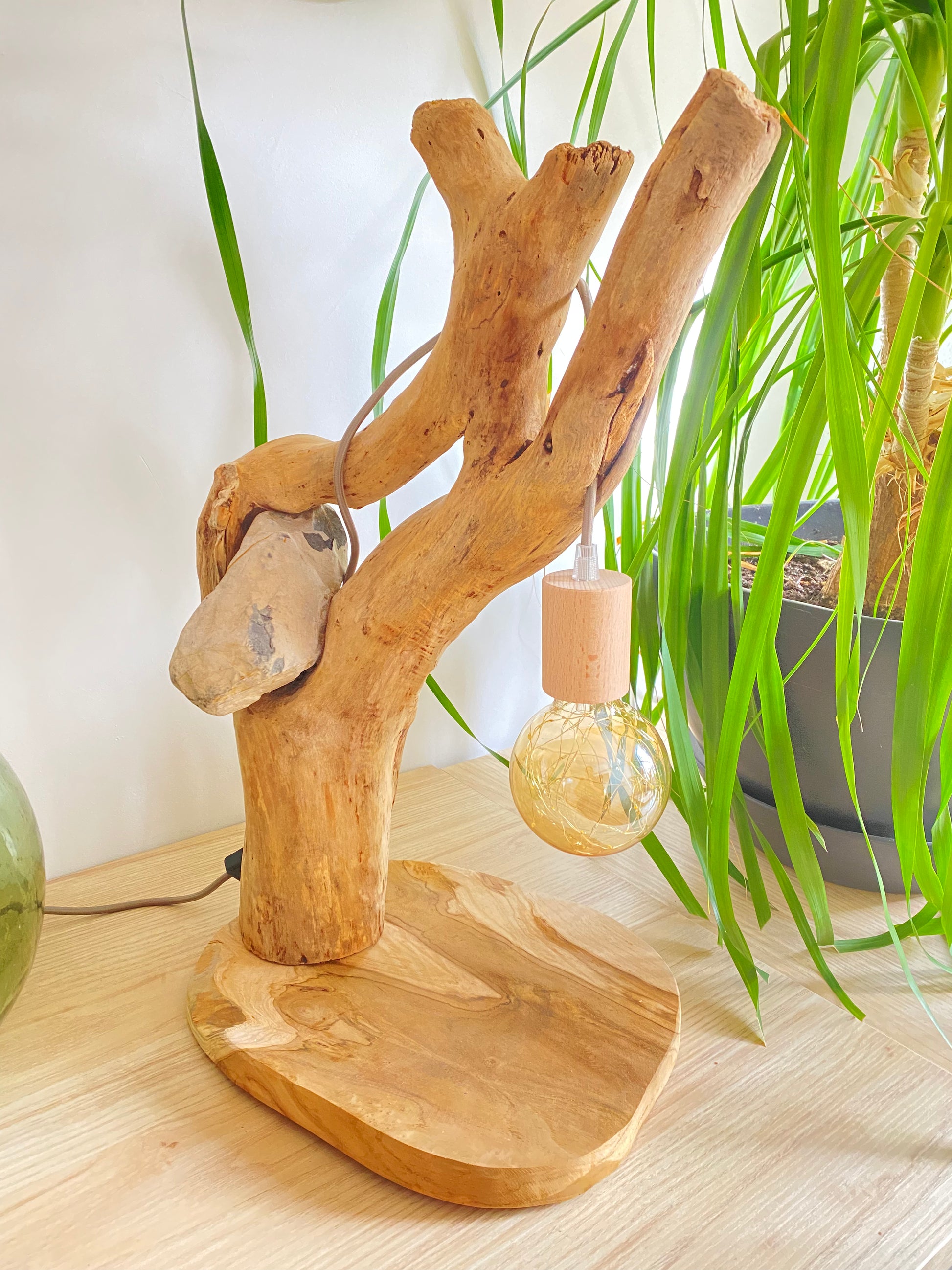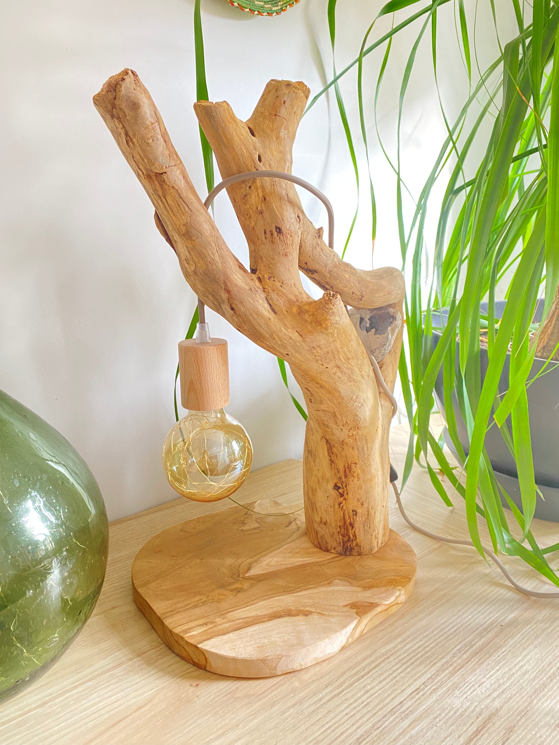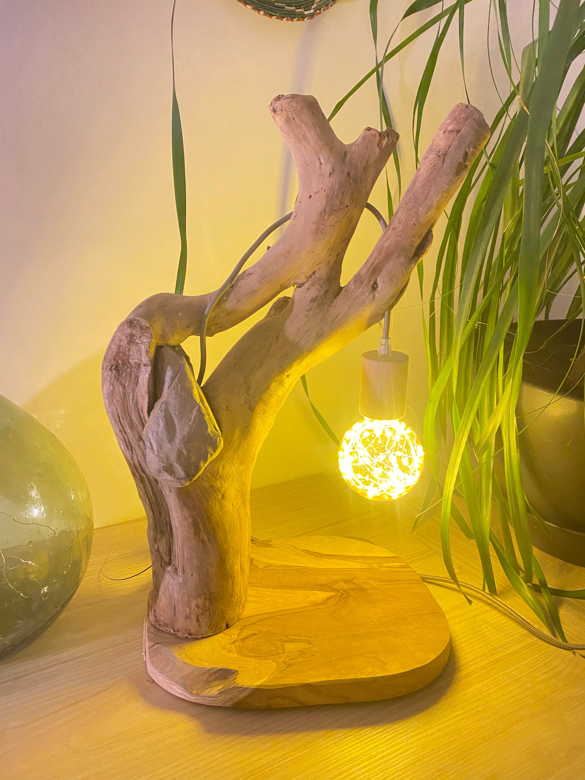 Lampe en bois flotté blanchie naturellement par le soleil sur les plages de Hyères.